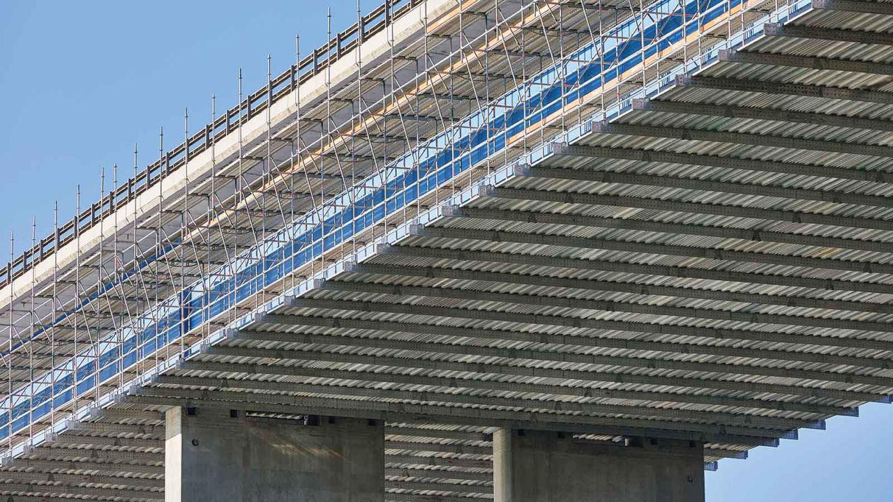 Závesné lešenia: Použitie v projektoch, kde je potrebné lešenie upevniť pod mostami alebo na šikmých plochách. Komponenty systému FlexBeam v kombinácii so stojkami systému ALLROUND je možné ukotviť na mostovú konštrukciu a vytvoriť závesné lešenie, ktoré Vám ušetrí množstvo materiálu v porovnaní s tradičným stavaním lešenia od zeme. Ďalšou veľkou výhodou je použitie systému FlexBeam v podmienkach, kedy nie je možná montáž lešenia od zeme, napr. rieka alebo frekventovaná cesta.