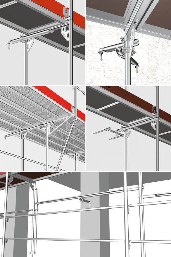 Speedy Vario systém nástennej kotvy – umožňuje štrukturálne výhodné ukotvenie kdekoľvek v rámci úrovne lešenia, dokonca aj mimo pripojovacích bodov montážnych rámov, ideálne pre budovy s mnohými oknami, skeletovými štruktúrami alebo podobnými situáciami