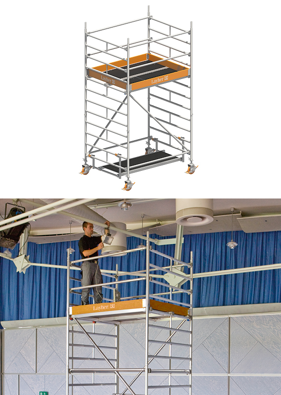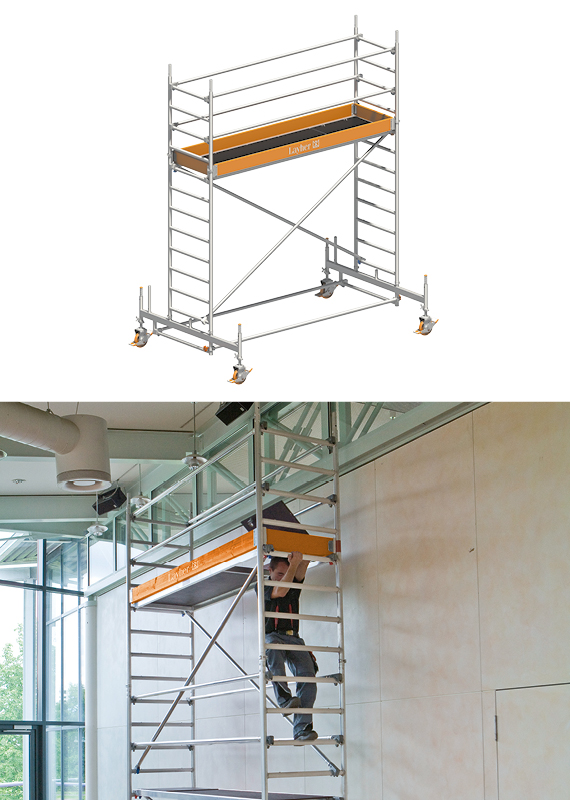 Použitie v schodiskových priestoroch: set umožňuje použitie častí mobilných veží v schodiskových priestoroch až do výšky pracovnej plošiny 5 m.