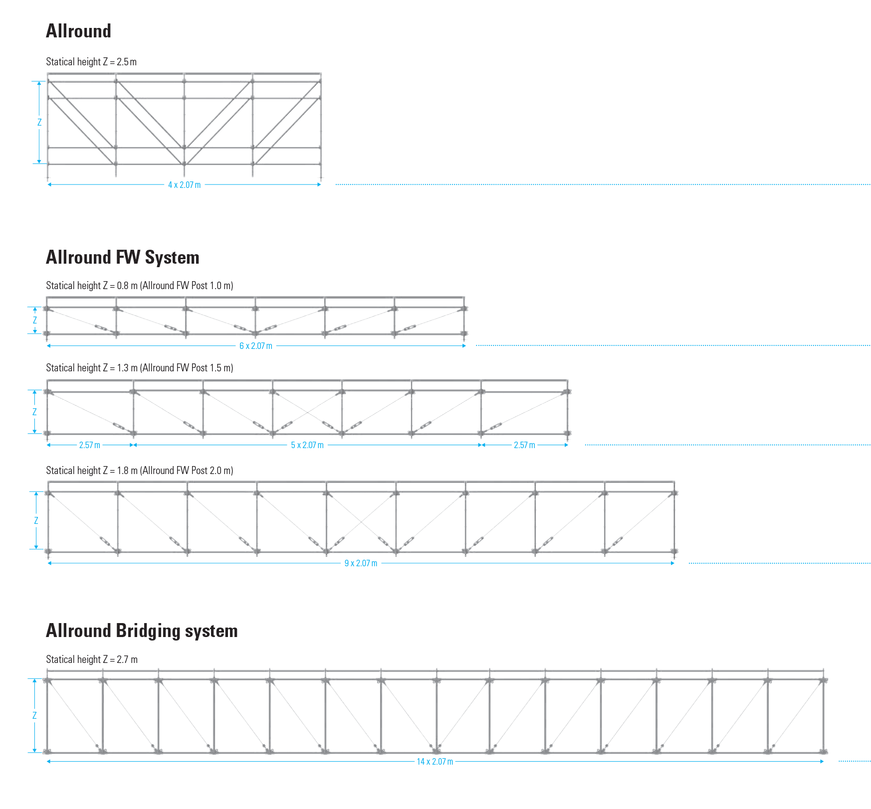 Bridging systém Layher ponúka efektívne a modulárne riešenie na tvorbu bezpečných a spoľahlivých mostov v stavebnom odvetví ako aj v priemyselnom lešení. Tento systém je navrhnutý s ohľadom na flexibilitu a jednoduchosť použitia, čo umožňuje rýchlu montáž mostov cez rôzne rozpätia. Využíva Allround systém lešenia, čo robí tieto mostíky ideálne na preklenutie prekážok, ako sú cesty alebo vodné plochy, alebo na zabezpečenie prístupu počas stavebných projektov. S využitím Bridging systému viete premostiť vzdialenosť do 30 m.